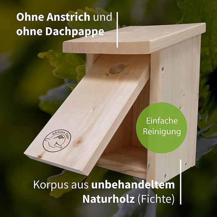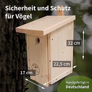 Tipp: Behandeln Sie das Vogelhaus mit einem Schutzöl auf Naturbasis (nicht im Lieferumfang enthalten), um die Langlebigkeit und Witterungsbeständigkeit zu erhöhen.